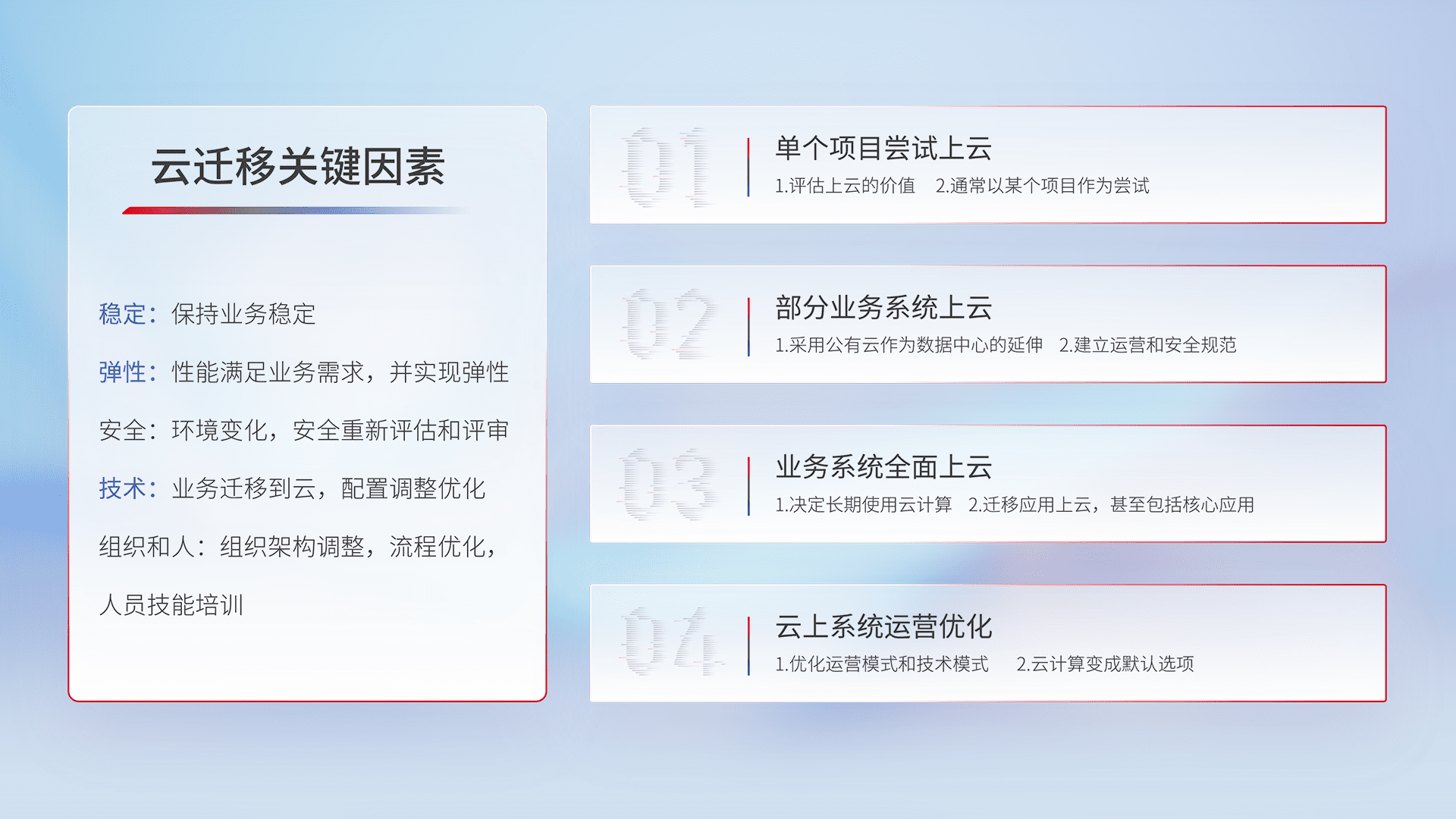 结合实际业务,,从规划设计、、云平台选型、、、云原生改造、、数据迁移、、、、集成交付,,,迁移全过程为客户识别最佳上云路径,,做好风险识别管理,,,设计网络架构、、、、身份权限、、、安全审计合规、、、、操作审计、、、日志审计、、、监控告警策略、、、多站点容灾设计等,,,,对云上基础设施进行整体规划,,,,提升IT治理水平,,,以满足弹性、、、高可用、、高性能的需求。。。。