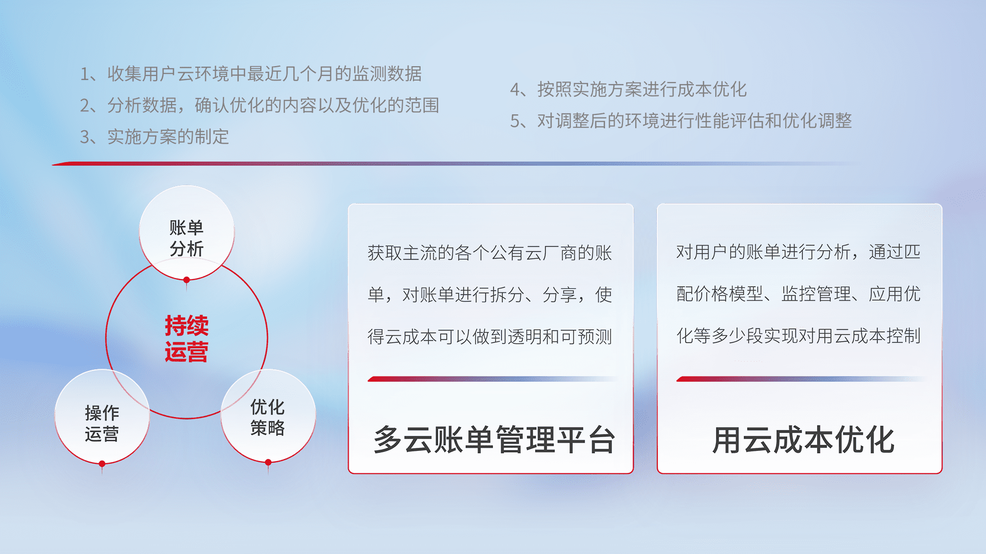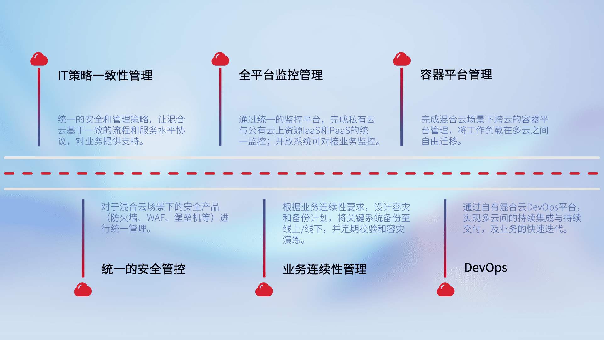 通过多云纳管,,,,以统一的资源数据模型把客户的云资源进行抽象和封装,,进而实现对多云资源的统一操作,,保障云资源管理的可靠性、、、稳定性与可用性。。。。量身定制化运维内容,,,配置、、、开发运维、、、补丁管理、、、备份、、、监控、、、、认证和访问管理、、、、审计和日常巡检等,,,保障在用云过程中的可靠度,,,稳定度以及高可用率。。。。