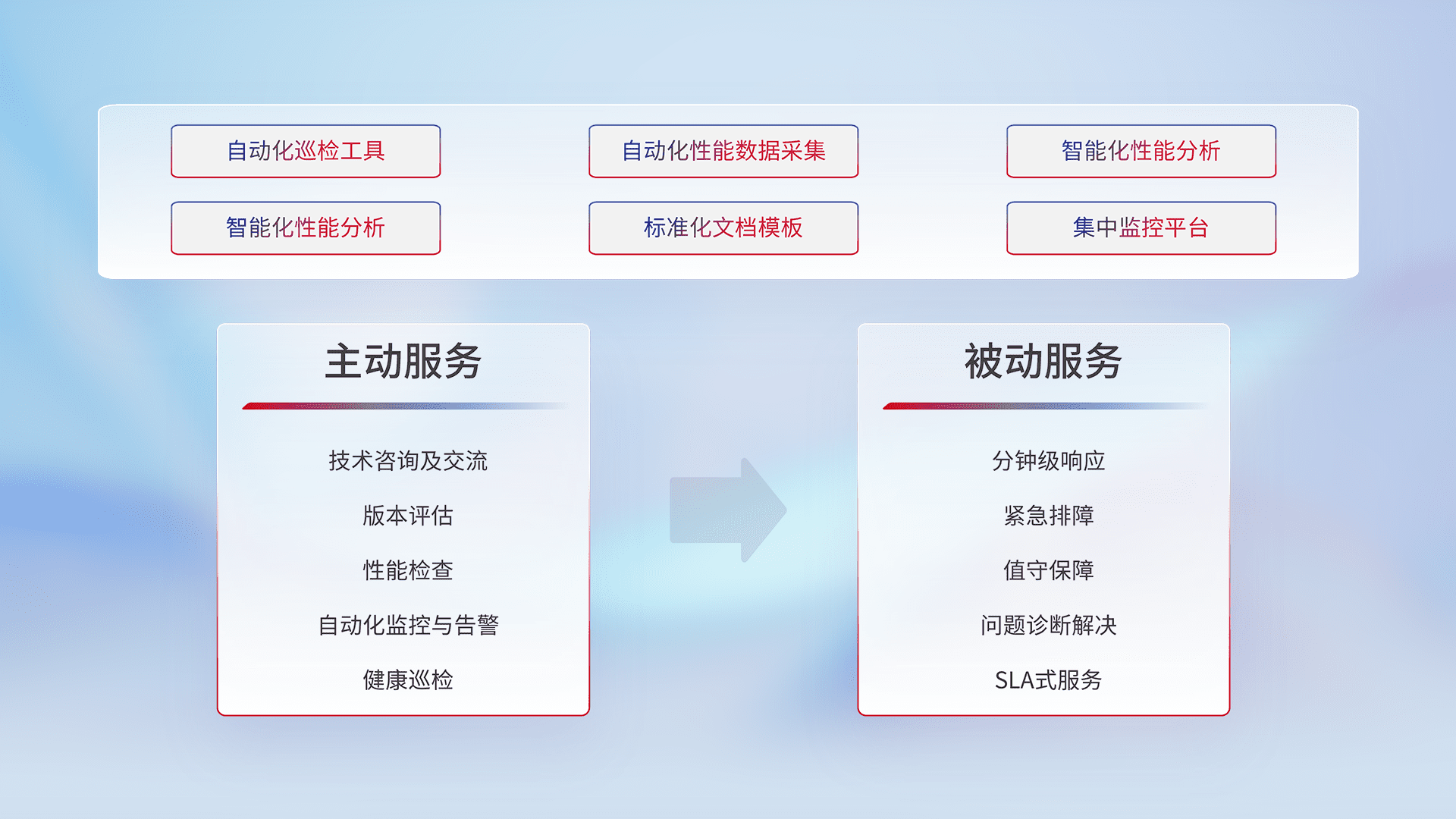 智能化工具和标准化文档,,保障服务质量,,,提供主动服务(包含技术咨询、、版本评估、、性能检查、、、自动化监控与告警、、健康巡检)和被动服务包含(分钟级响应、、、、紧急排障、、值守保障、、问题诊断解决、、SLA服务)。。。